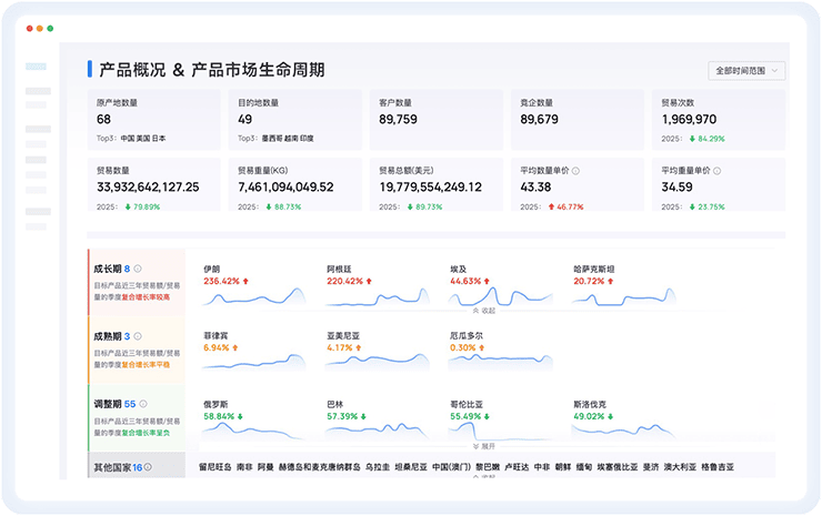 基于100亿+海量真实进出口数据,结合精准搜索功能,精准分析全球市场变化,找寻更有价值的开发市场,挖掘新的产品开发方向,帮助企业定位增长方向。